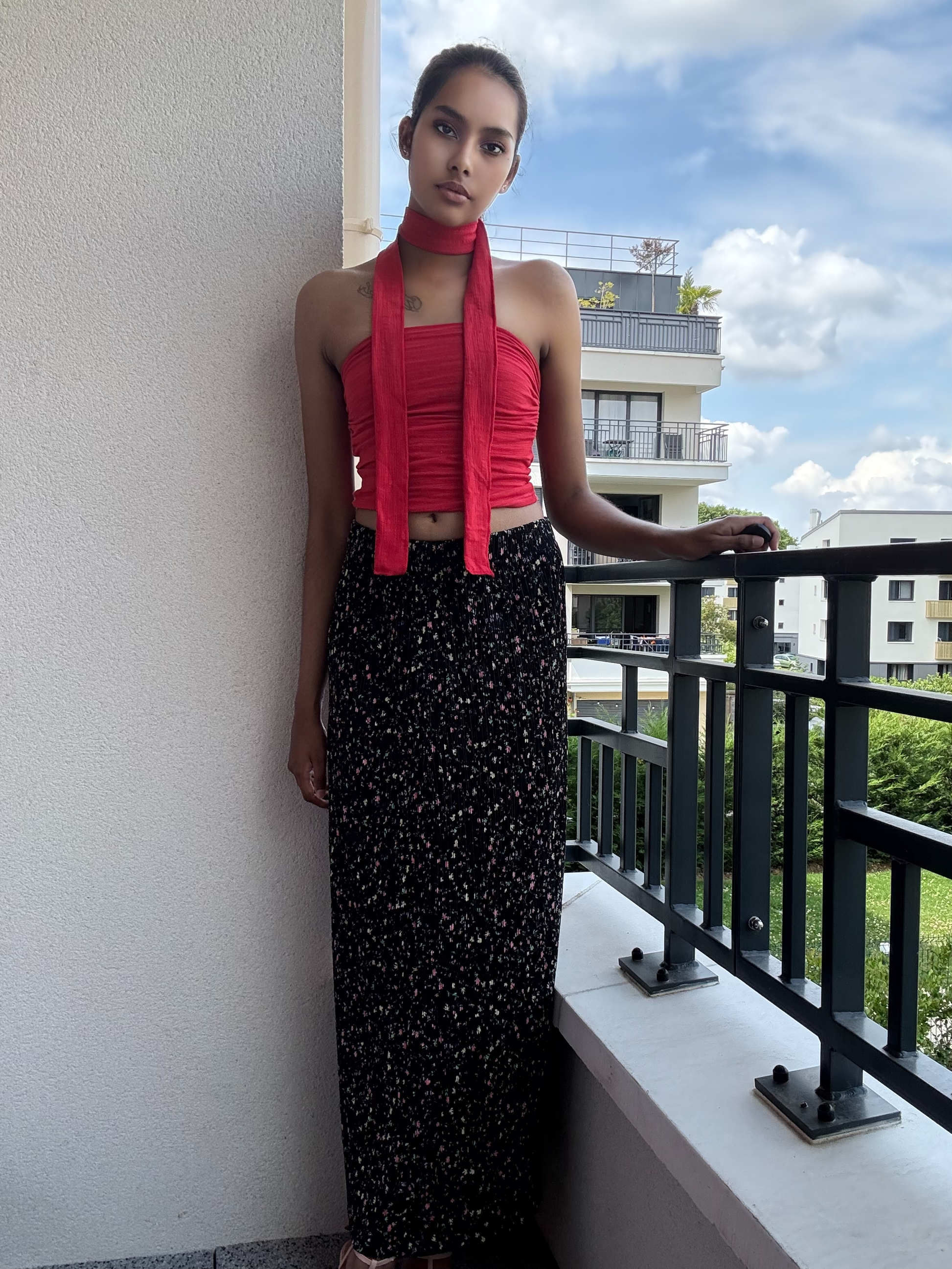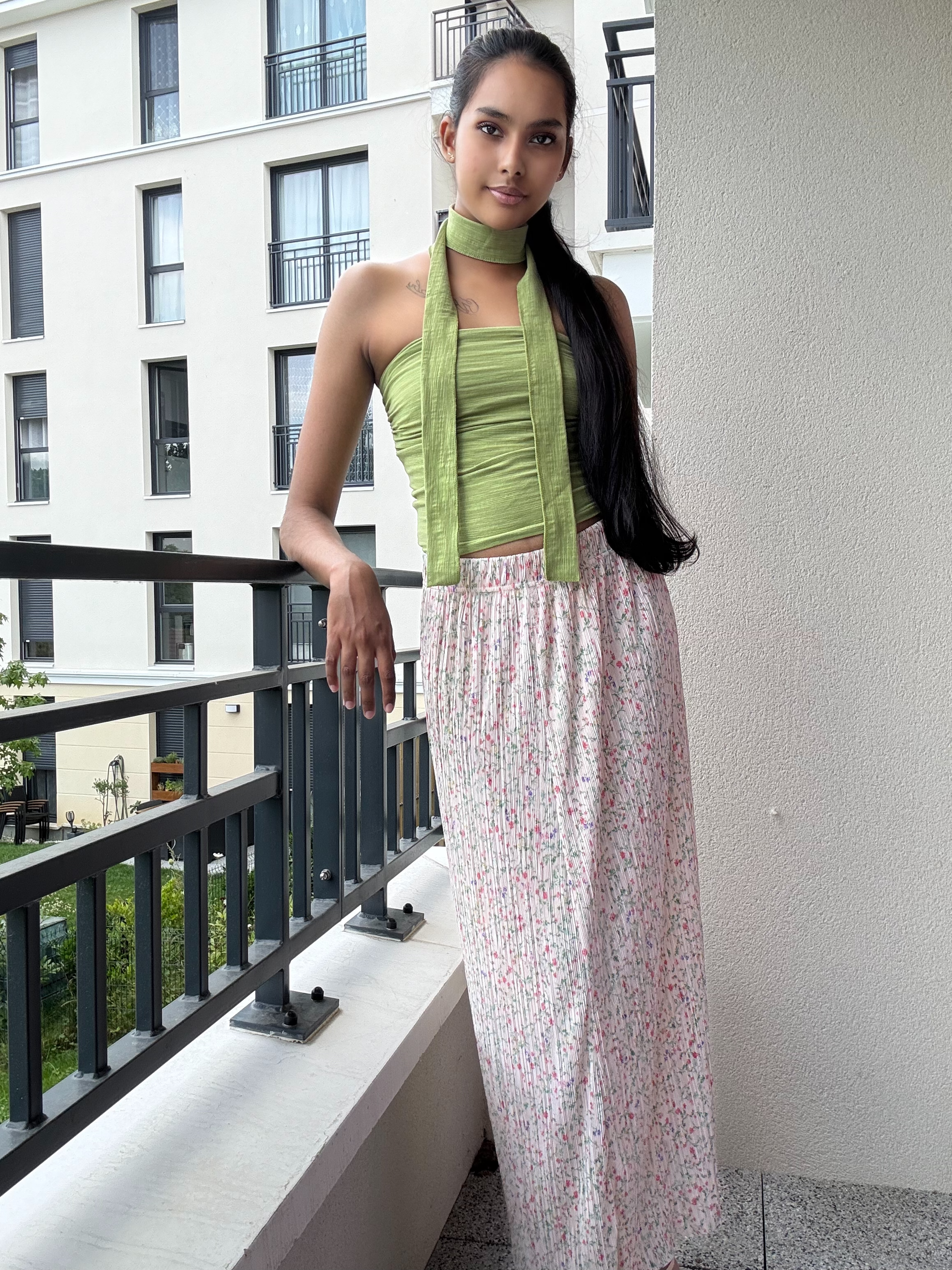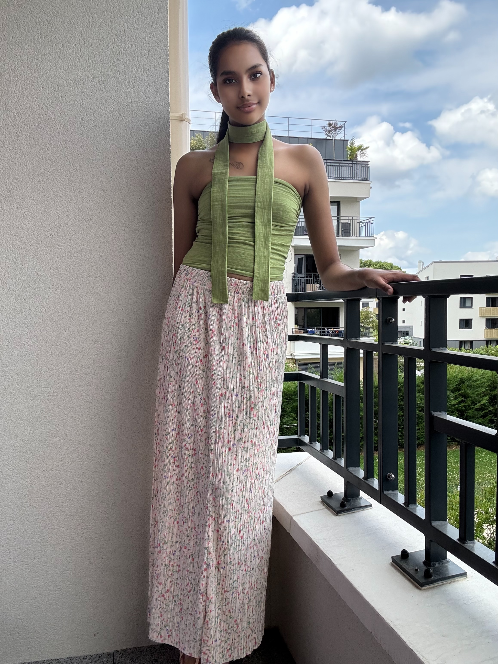 Natacha mesure 1m70 et porte une taille unique. La jupe est à élastique et peut aller du XS au L. Quant à la couleur, la jupe est nacrée, donnant un magnifique rendu à la lumière du jour.