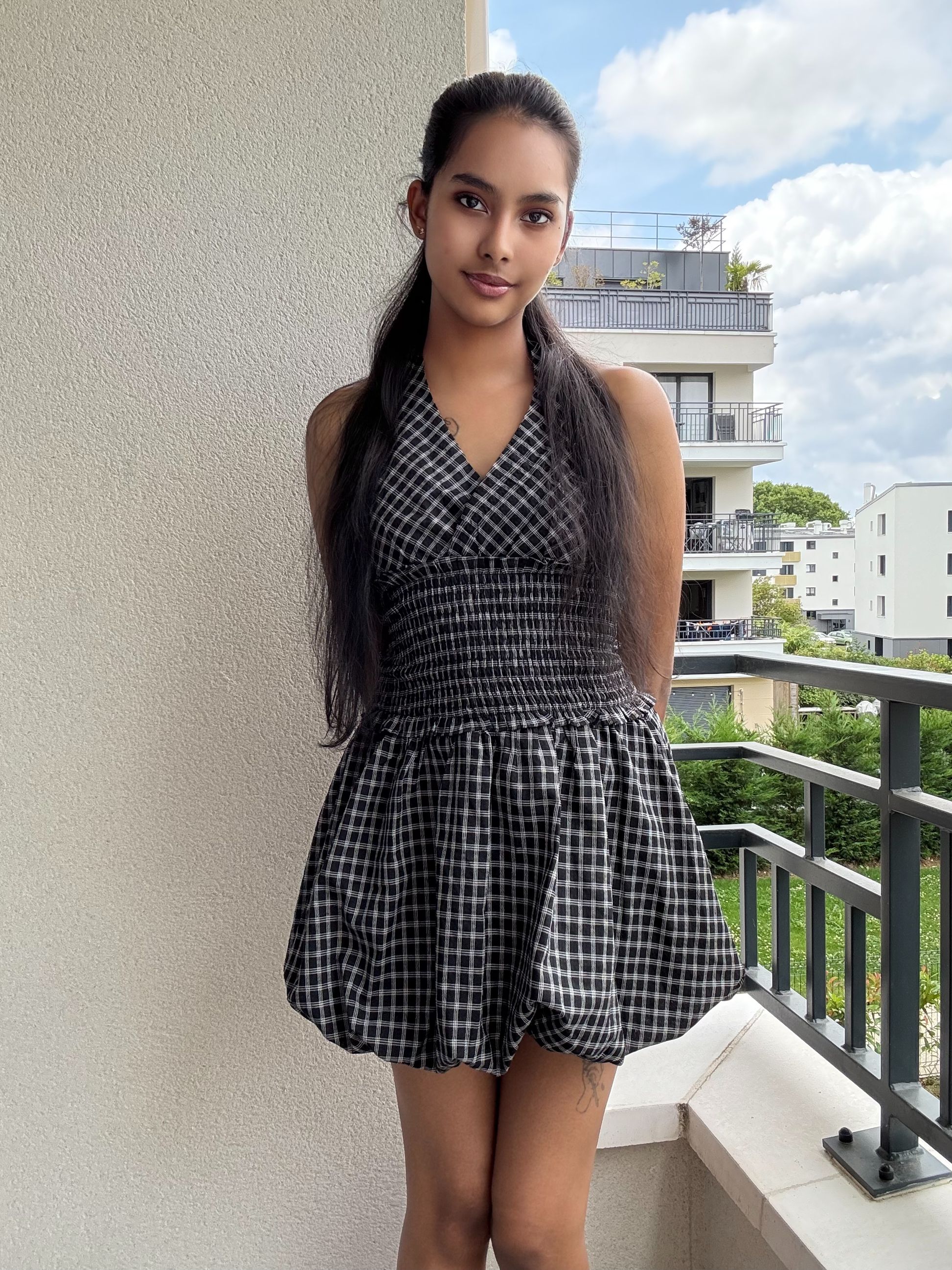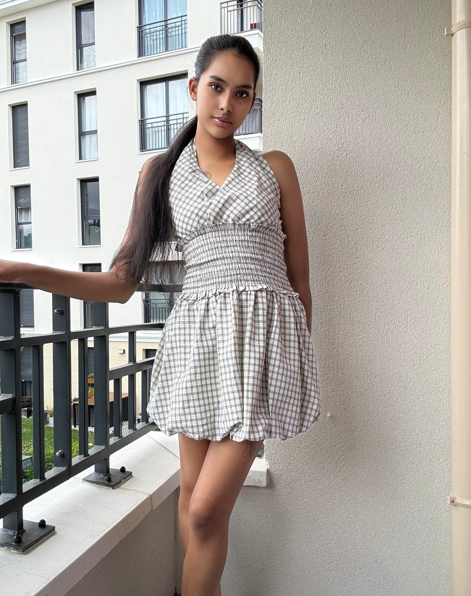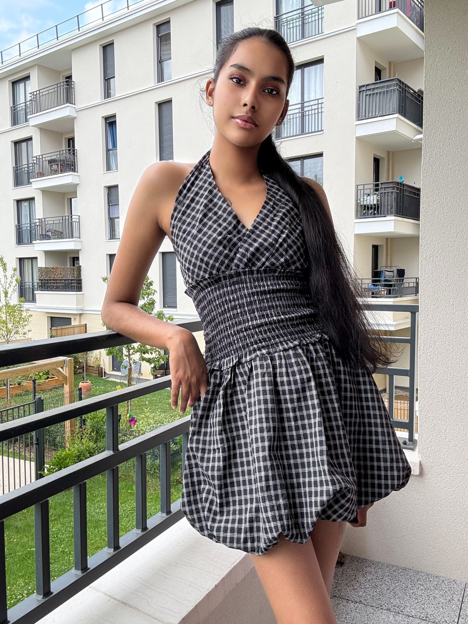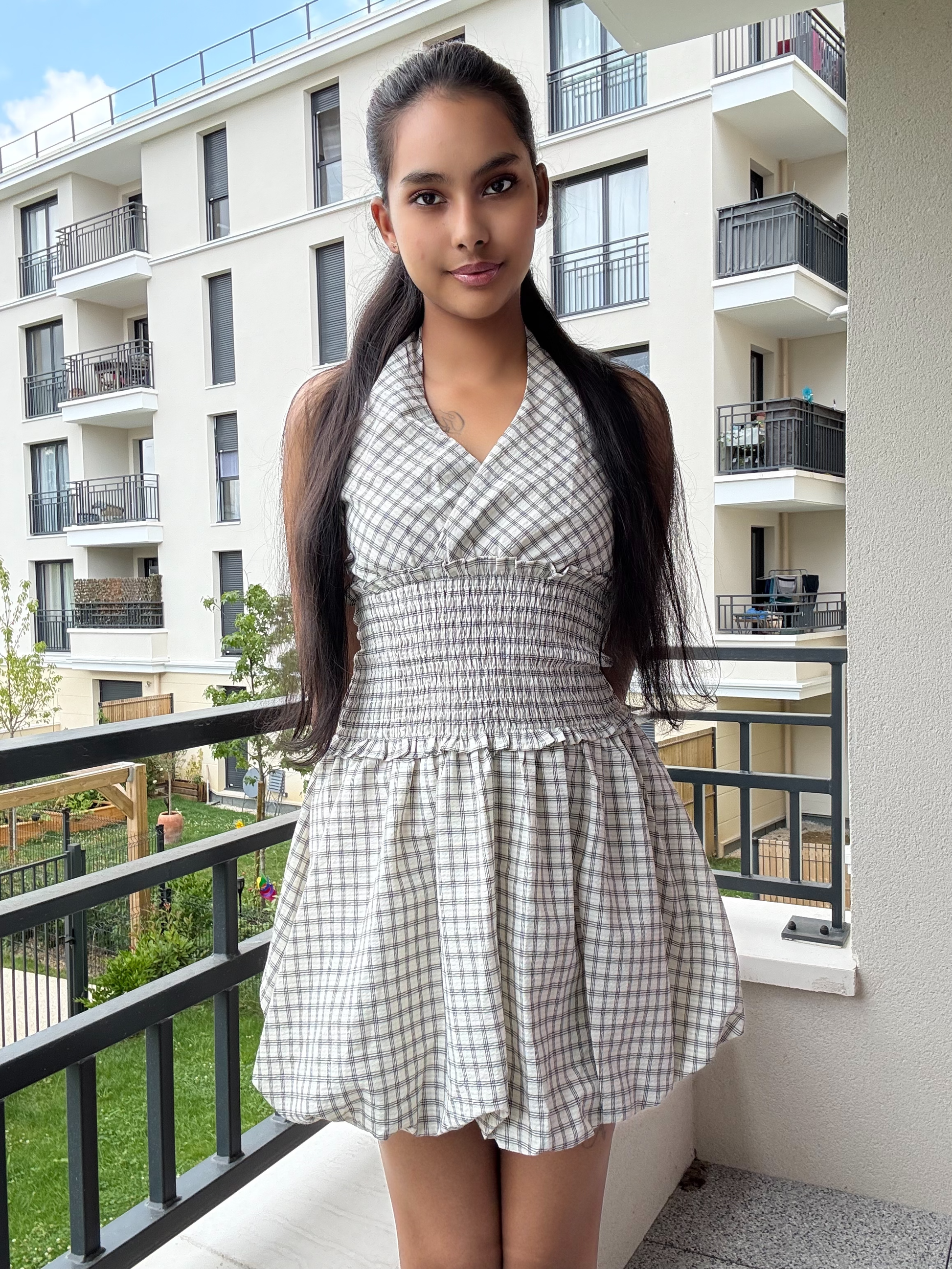 Natacha mesure 1m70 et porte une taille unique. La robe est extensible grâce à son élastique au dos et peut aller du XS au L.